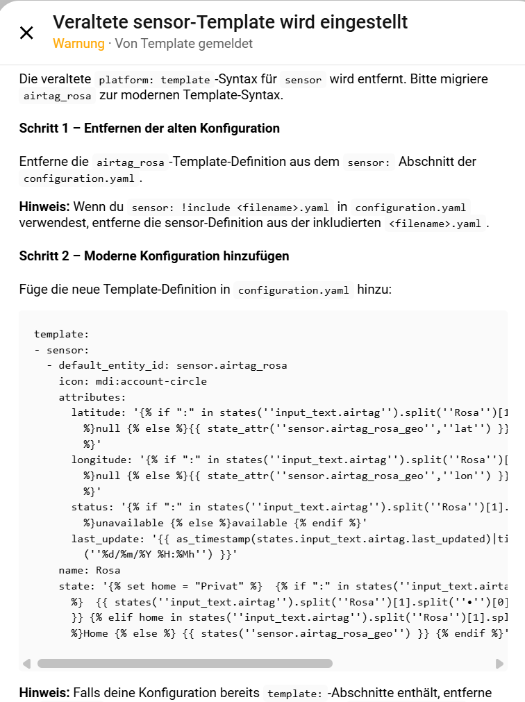 %}Home {% else %} {{ states(''sensor.airtag_rosa_geo'') }} {% endif %}'Restart Home Assistant or Reload Entities to complete the reconfiguration.